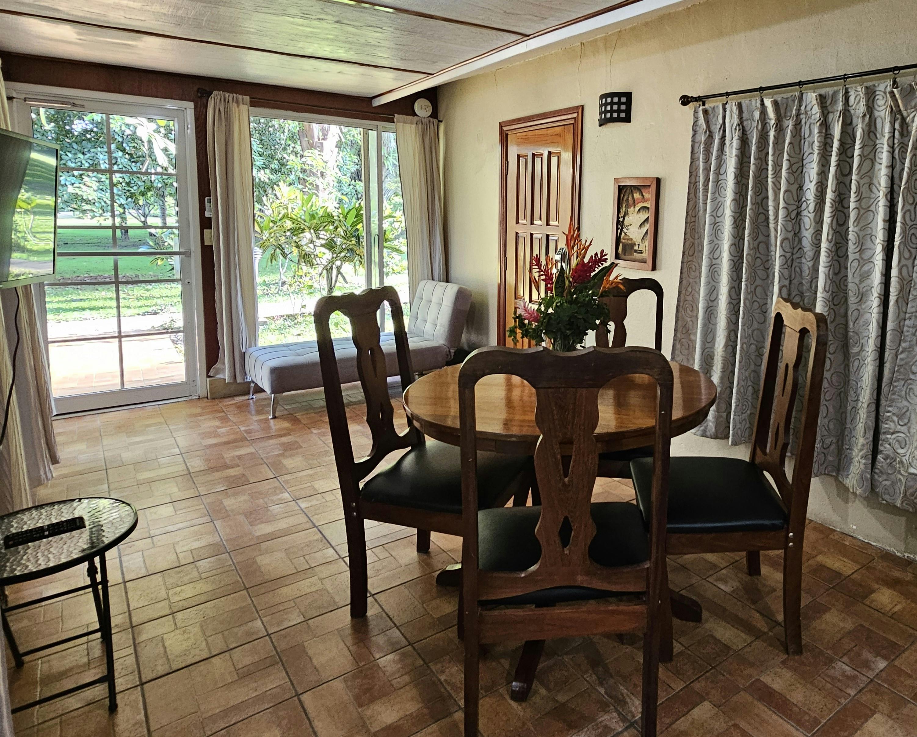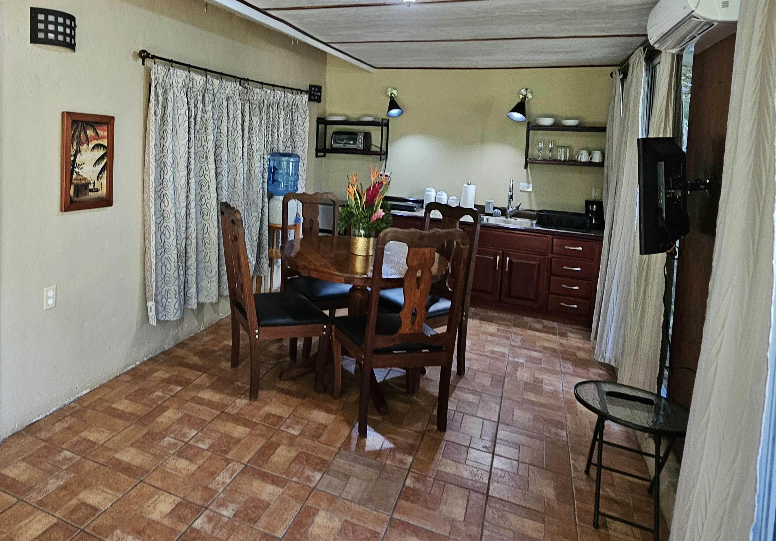 Air-Conditioned Open Area: Features a cozy chaise lounge, dining area, and a Smart TV. Enjoy views of our beautifully landscaped gardens and the Kiki Witz Resort Pool.